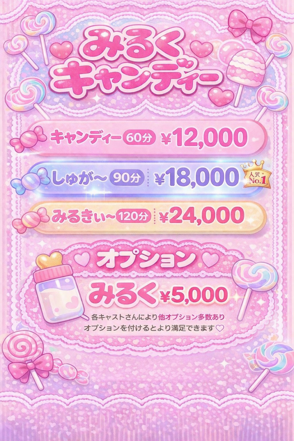 | 当店について | 🍼みるくキャンディー — 甘く惑わせる、大人の誘惑時間💋 扉を閉めた瞬間…空気が変わる。 しなやかな指先、ゆっくり沈むオイル…じわり広がる熱に、思わず呼吸が乱れるお兄様も続出…🥀 魅せ方を知り尽くした日本人キャストが、上品な色香で心まで奪いにいきます✨ “今日はとことんトロかされたい…” そんな欲を、そっと刺激してくれる甘く危険な癒し🫧 大人の快感スイッチ…ここで入ります💖 |